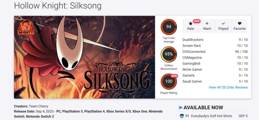 Главные новости » Эксклюзив » Критики ожидаемо в восторге от Hollow Knight: Silksong — оценка выше 90 баллов