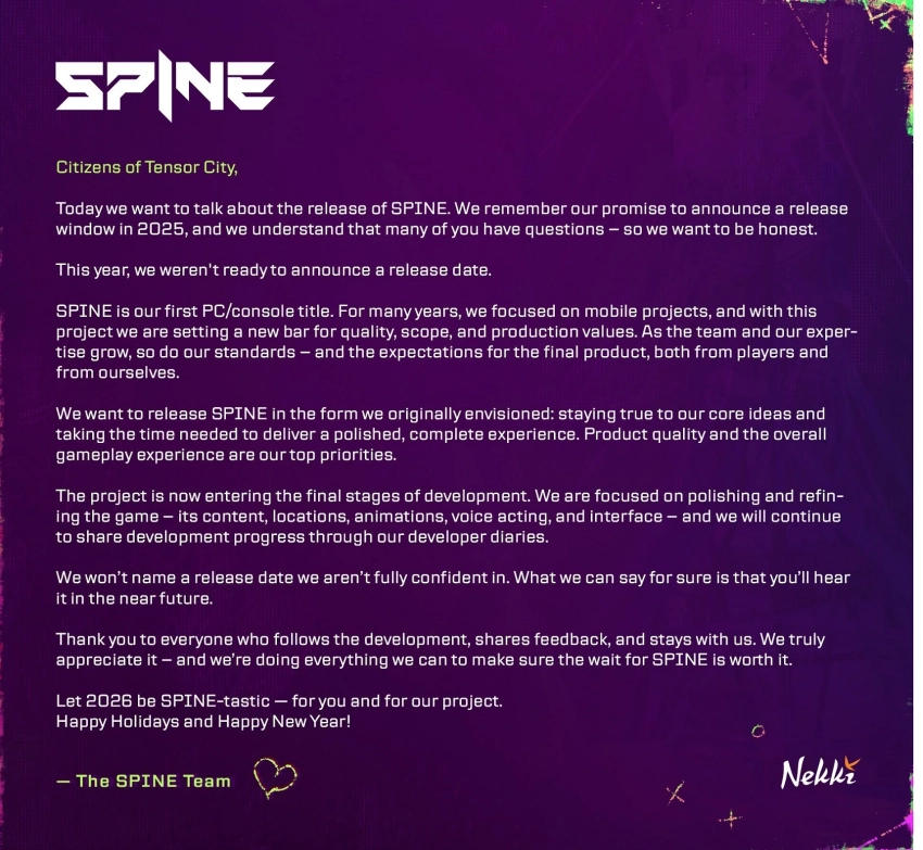 Главные новости » Эксклюзив » Авторы экшена Spine извинились за невыполненное обещание назвать дату релиза в 2025 году