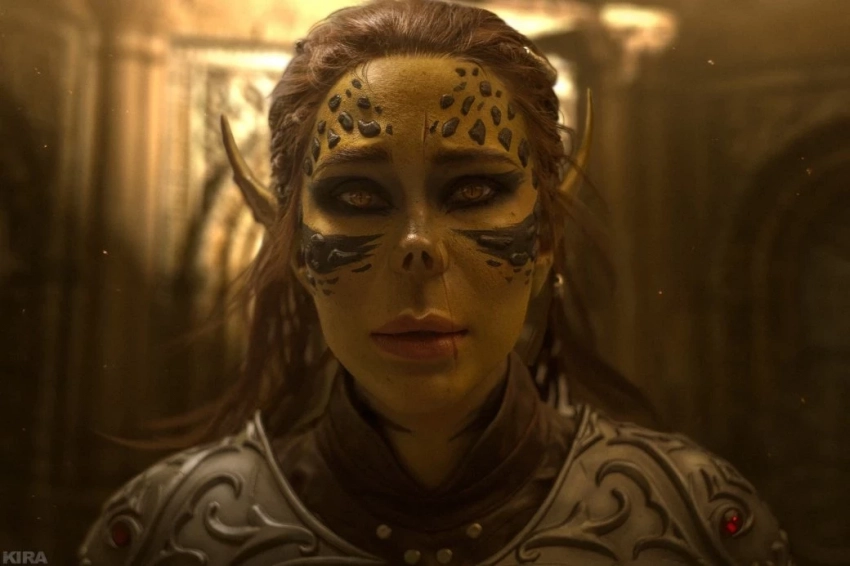 Запечатлела образ гитьянки-воительницы с длинными темными волосами, желтовато-зеленой кожей и желтыми глазами с вертикальными зрачками фотограф Кира Митенкова.