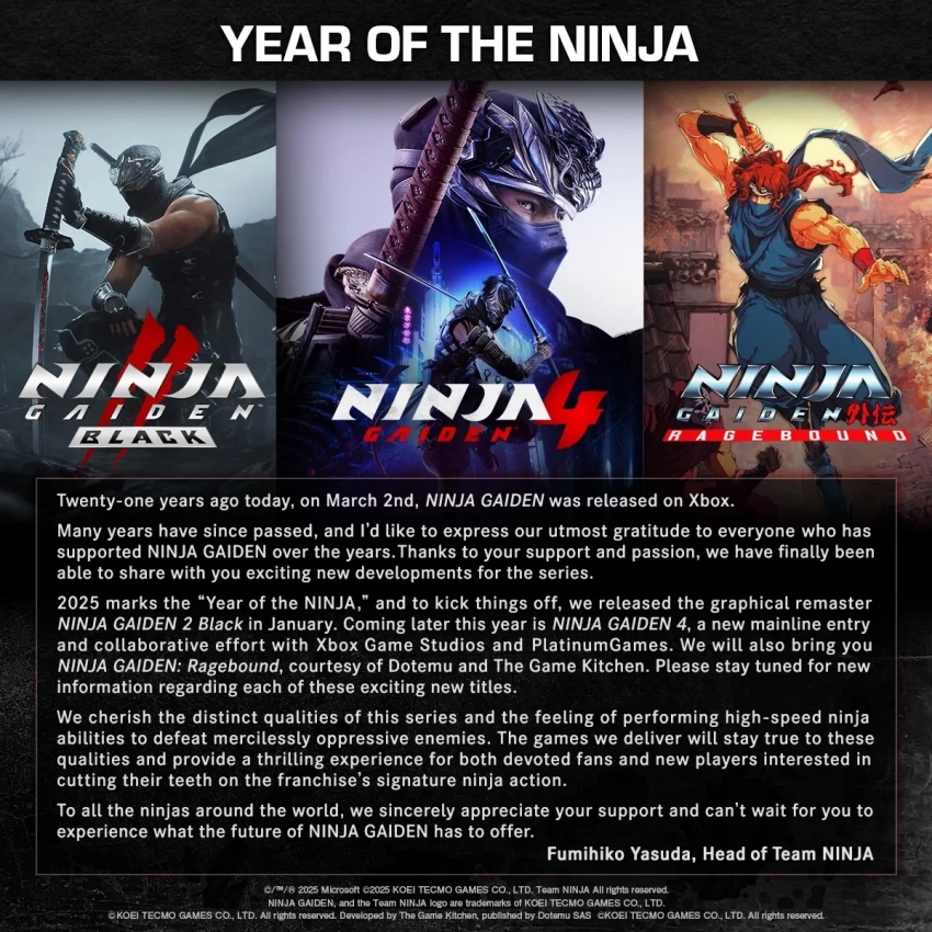 2025 год знаменует собой «Год Ниндзя», и мы начали его с релиза графического ремастера Ninja Gaiden 2 Black в январе. Позже в этом году выйдет NINJA GAIDEN 4, новая полноценная часть [серии] и плод совместных трудов Xbox Game Studios и Platinum Games. Мы также готовится выпустить Ninja Gaiden: Ragebound [прим. — релиз летом 2025 г.], созданную Dotemu и The Game Kitchen (создатели Blasphemous). Пожалуйста, следите за новостями о каждой из этих захватывающих новых игр.