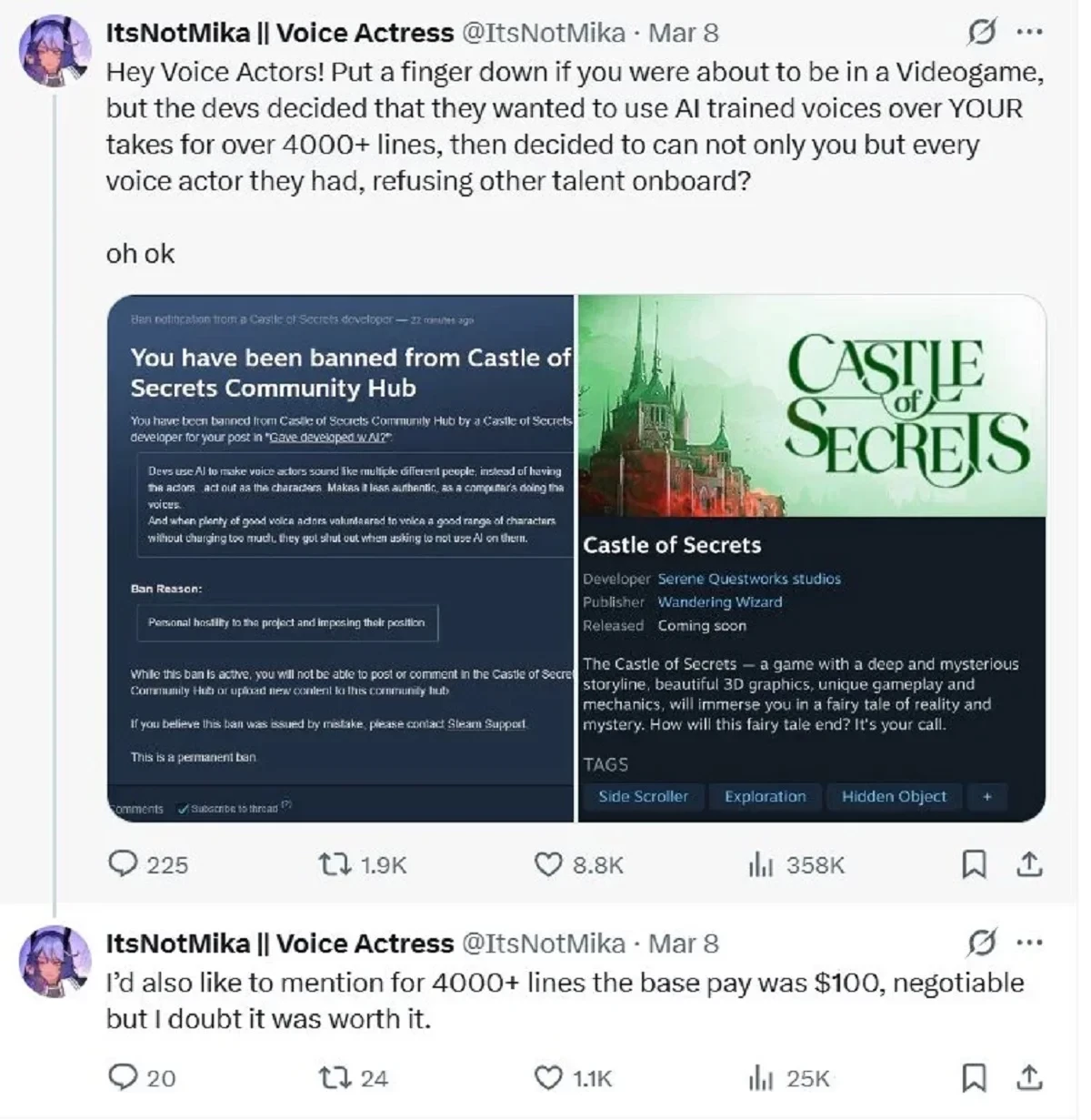 Подозреваемой в деле оказалась студия Serene Questworks, которая работает над своим дебютным приключением Castle of Secrets. Её обвинили в замене реальных актёров озвучки с уже записанными дублями на генеративный ИИ.
