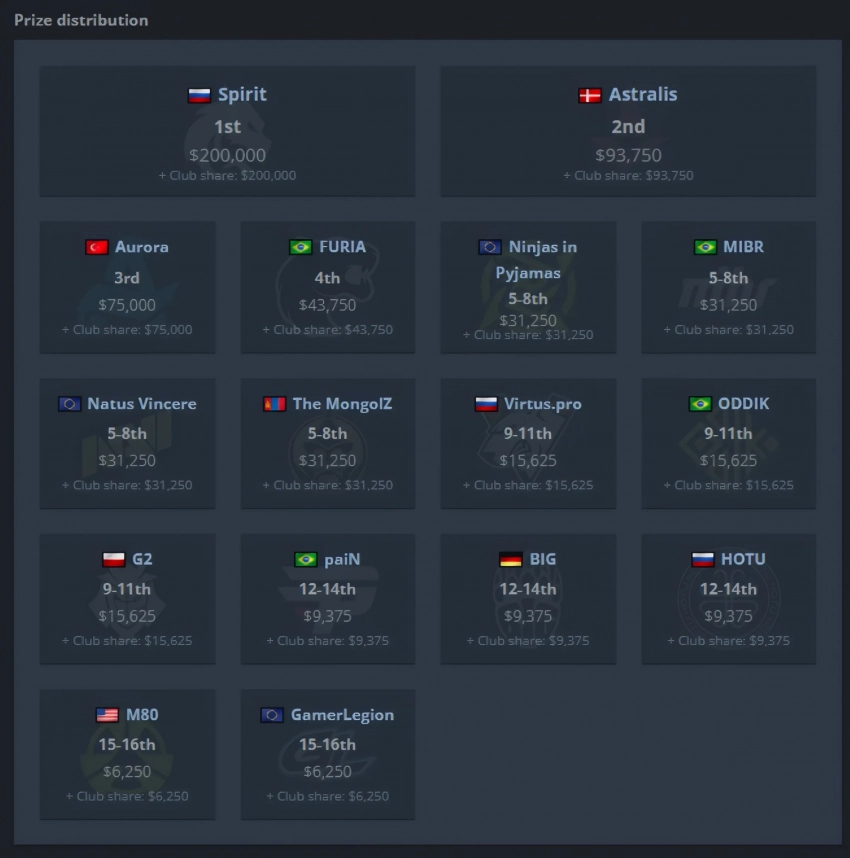 Таким образом, команда Team Spirit заработала 200 $ тысяч. Astralis на второй позиции стала богаче на 93,750. $