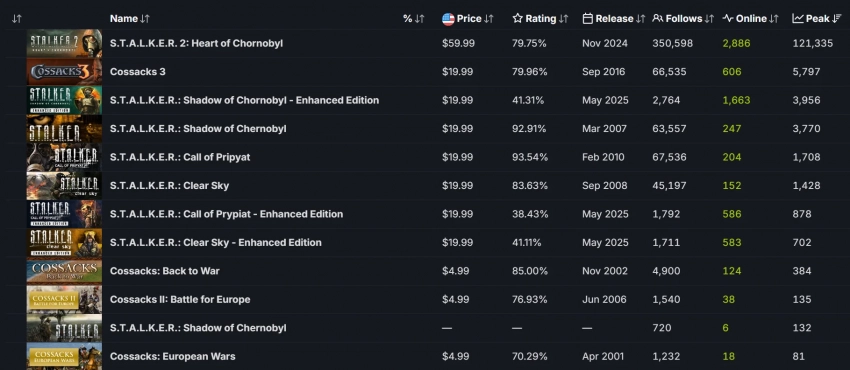 Отметим, что S.T.A.L.K.E.R.: Shadow of Chornobyl - Enhanced Edition смогла обогнать оригинальную игру по пиковому онлайну — в шутере одновременно находилось почти четыре тысячи человек. Впереди среди игр разработчиков остаются лишь третьи «Казаки» и S.T.A.L.K.E.R. 2.
