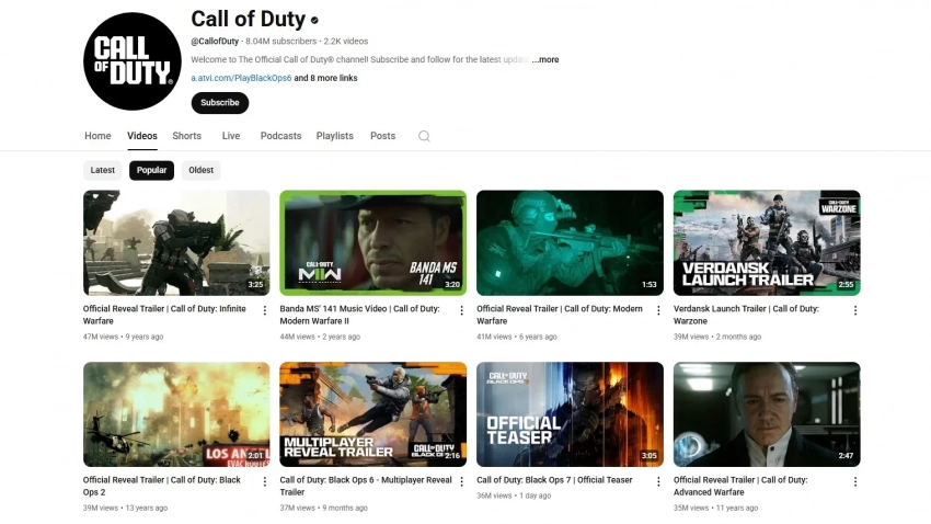 Самым просматриваемым роликом на официальном YouTube-канале остаётся официальный трейлер Call of Duty: Infinite Warfare с 47 млн просмотров.