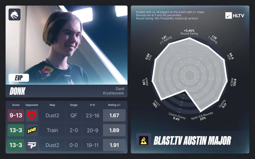 Данил «donk» Крышковец из России, несмотря на выход лишь в четвертьфинал, заслужил звание сильнейшего EVP благодаря своим впечатляющим статистическим показателям. Его игра за команду Team Spirit была ярким примером мастерства и таланта.