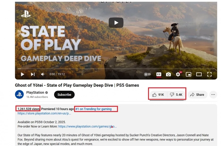 Ролик на официальном YouTube-канале PlayStation лидирует в игровых трендах и собирает положительные комментарии. С премьеры у него накопилось более 1,2 млн просмотров и 91 тыс лайков (против 5,4 тыс дизлайков).