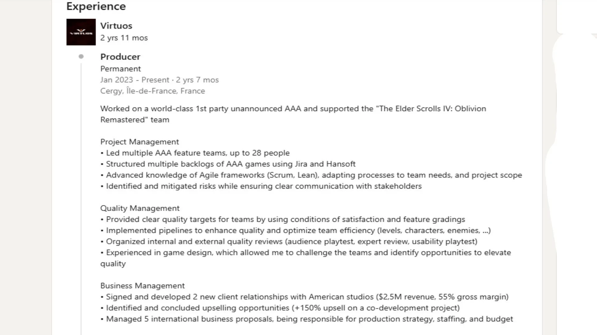 Ещё больше интересных видео на YouTube канале Игромании!Скриншот Cyberpunk 2077ПродюсерVirtuos Реми Жинуайе поделился в LinkedIn информацией о проектах, над которыми работает студия. Эта информация быстро была удалена, однако сохранились её скриншоты. Согласно им, авторы ремастера The Elder Scrolls 4: Oblivion трудятся над «неанонсированным высокобюджетным проектом мирового уровня».