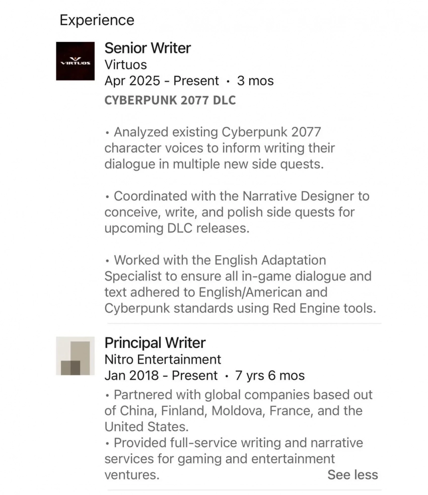 В сервисе LinkedIn некоторое время назад нашлась ещё одна подсказка. Как оказалось, нарративный дизайнер и ведущий сценарист Virtuos с апреля 2025 года работает над побочными квестами для дополнения к Cyberpunk 2077. Эта информация тоже вскоре была удалена из профиля.