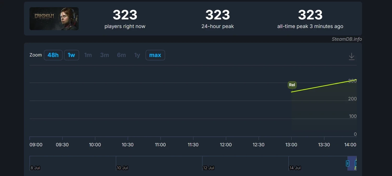 Пиковый онлайн пока не может похвастаться невероятными результатами. Сейчас в Eriksholm находится более 320 человек, однако в ближайшие часы пик наверняка повысится. При этом стоит учесть, что стелс-приключение — довольно нишевая игра и дебют студии River End Games. Она не сможет привлечь к себе столько внимания, как громкие хиты крупных издательств и зарекомендовавших себя разработчиков.