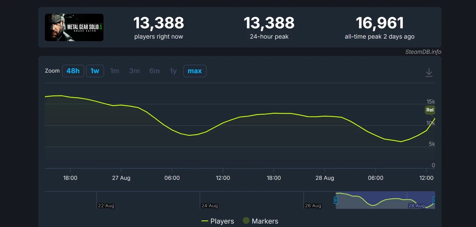Увы, пока новинка не смогла побить пик онлайна, достигнутый вскоре после выхода в расширенном доступе для владельцев Deluxe-издания. Тогда в игре находилось практически 17 тысяч человек. В момент написания новости Metal Gear Solid Delta: Snake Eater наслаждаются более 13 тысяч геймеров, поэтому обновление рекорда пикового онлайна в ближайшие часы и на выходных практически очевидно.