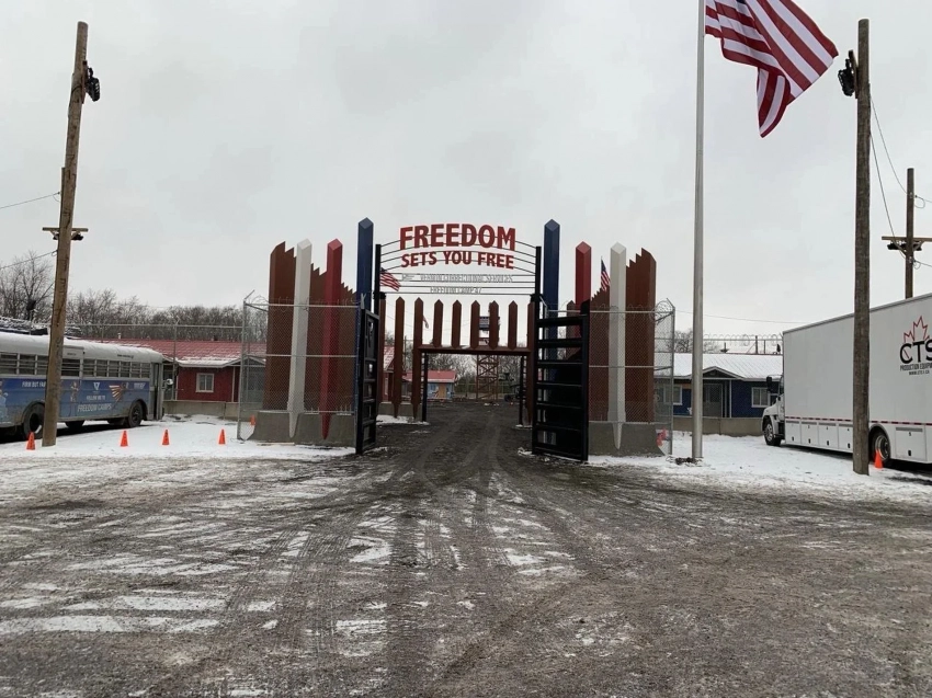5 фотоФотографии показывают, какое будущее ожидает несогласных: «лагеря свободы», над входом в которые находится лозунг «Свобода освобождает», напоминающий о пресловутом «Труд освобождает» в концентрационных лагерях.