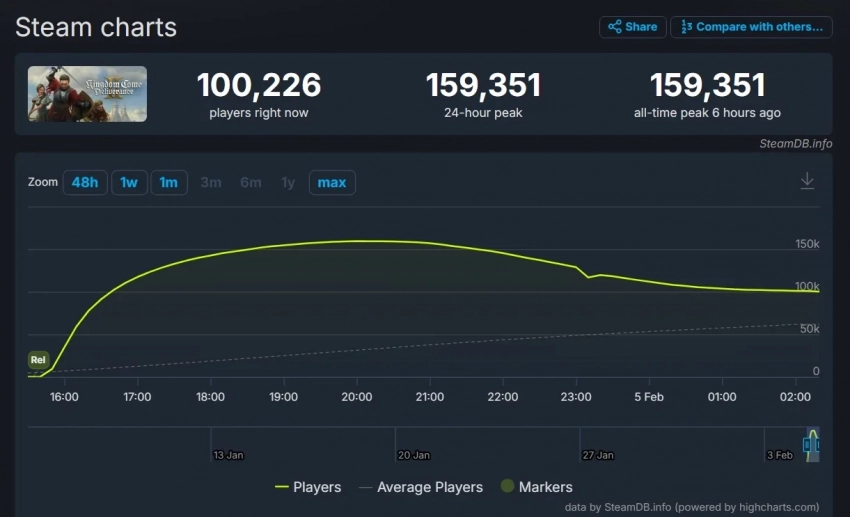 Напомним также, что пиковый онлайн Kingdom Come: Deliverance 2 в Steam быстро побил рекорд своей предшественницы. На момент написания новости он составляет 159 351 игроков одновременно.