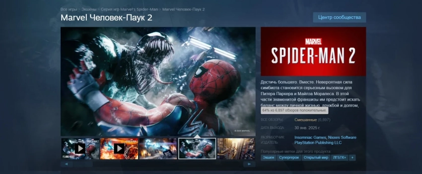 PC-порт Marvelʼs Spider-Man 2 вышел в конце января и занял третье место в свежем чарте Steam. Местный рейтинг игры оказался «смешанным», а её пиковый онлайн смог обойти Days Gone. Но не сразу.