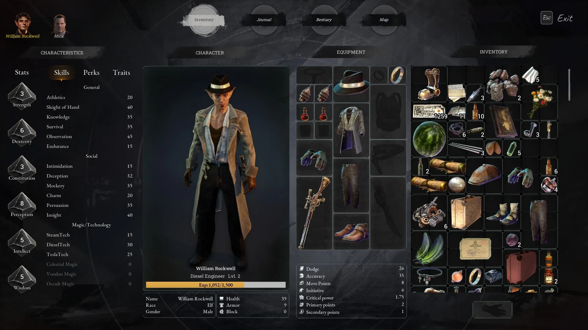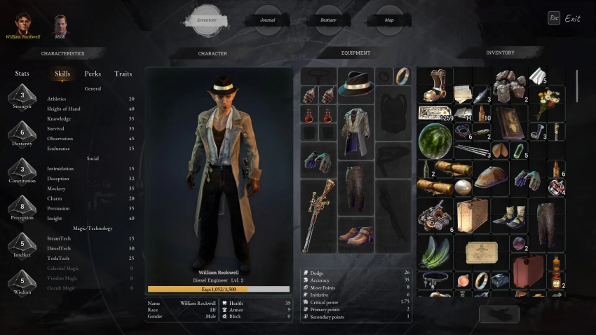Так выглядит инвентарь главного героя: при желании вещи можно передавать спутникам. Здесь же есть шкала опыта: при повышении уровня мы можем улучшать характеристики героев.