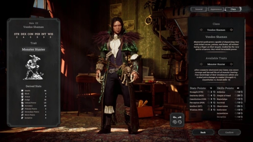Как и положено, новинка начинается с редактора персонажа — относительно небольшого. Из более или менее значимого здесь для начала можно определить расу героя: человека или эльфа. Решение сразу же повлияет на базовые характеристики протагониста: у людей всё сбалансированно, а эльфы слабы, но более восприимчивы и ловки.