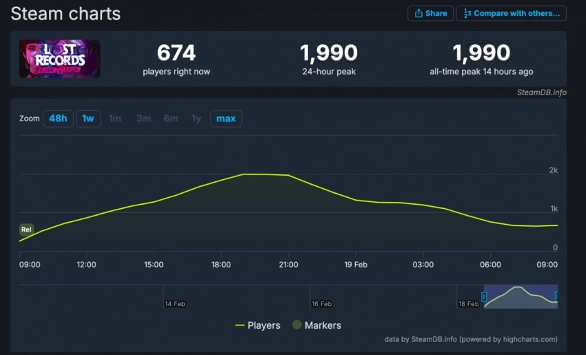 Онлайн новинки в Steam, правда, нельзя назвать «хитовым» — пик составил 1990 игроков, а данный момент в игре находится 674 человека.