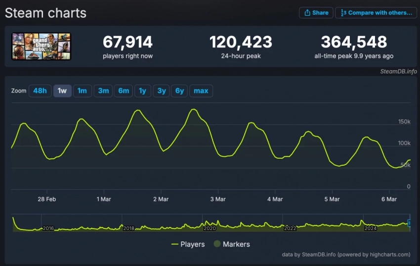 Если сравнивать с обычной GTA 5, то её пик онлайна за последний день перевалил за 120 тысяч, а сейчас игра привлекла почти 68 тысяч человек.