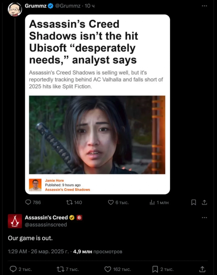 Саркастичное замечание от лица аккаунта «Теней» в соцсетях набрало огромную популярность (уже больше 377 тысяч лайков), а чатбот Grok «оценил» ответ компании на «9 баллов из 10». Причём на этом админ профиля боевика Ubisoft «не остановился».