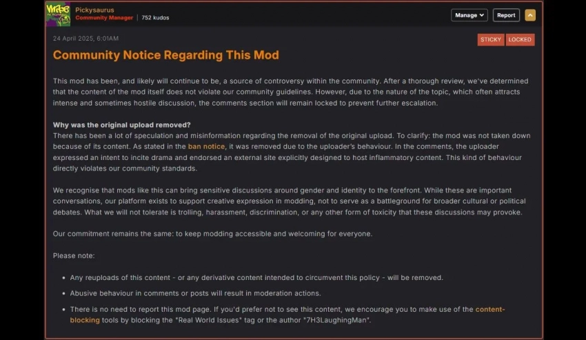 Удар по кошельку оказался критическим: администраторам пришлось пересмотреть бан. Мод Body Type Selector вернулся на Nexus, правда, в объяснительном посте всю вину свалили на скандальное поведение его автора. Теперь комментарии на странице отключены во избежание дальнейшего развития скандала.