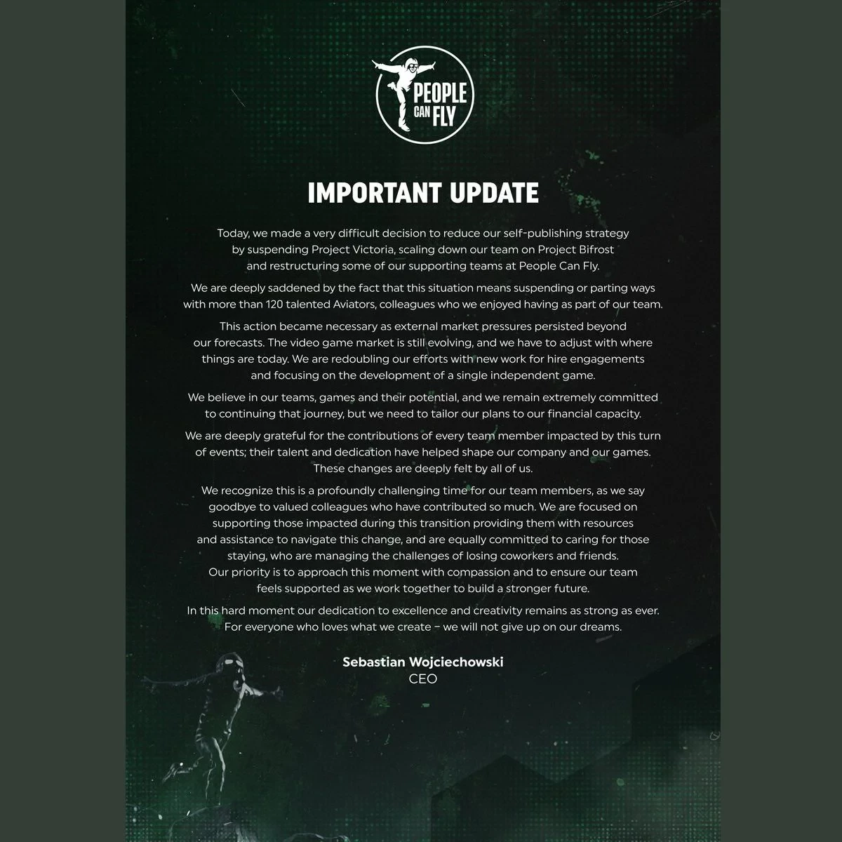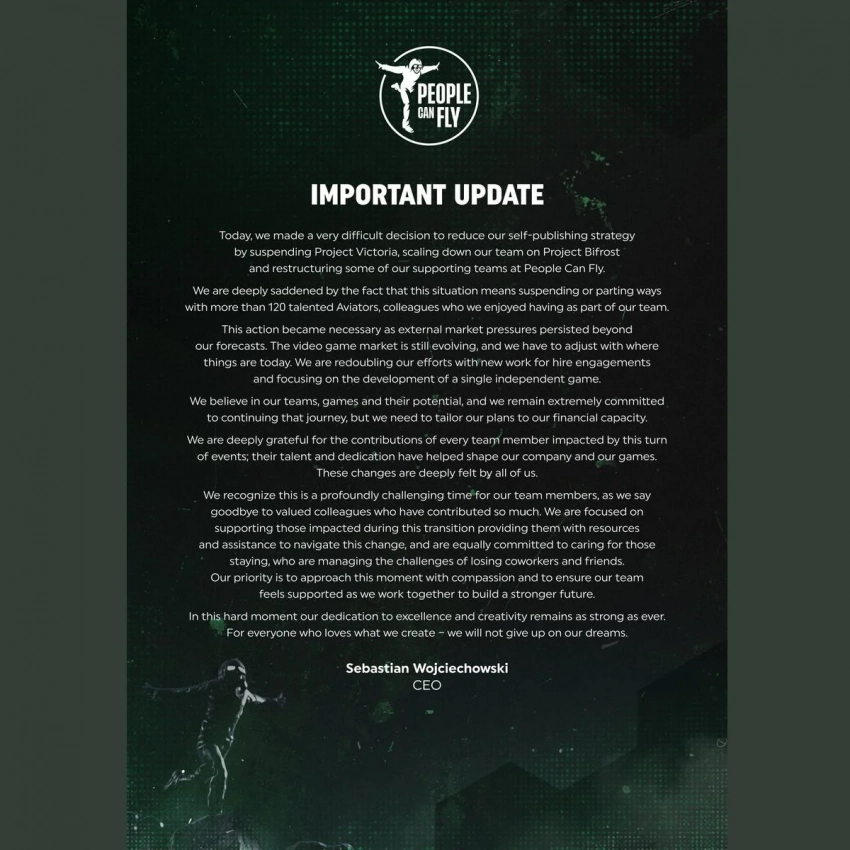 Студия сослалась на непреодолимое давление рынка игр, который в последние годы претерпевает не самые благоприятные для разработчиков изменения. Напомним, что это уже не первое масштабное сокращение в People Can Fly: в январе работы лишилось свыше 30 сотрудников. А финансовые сложности обрушились на команду после провала амбициозной Outriders.